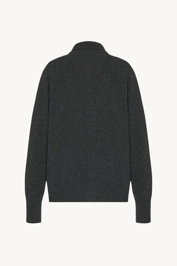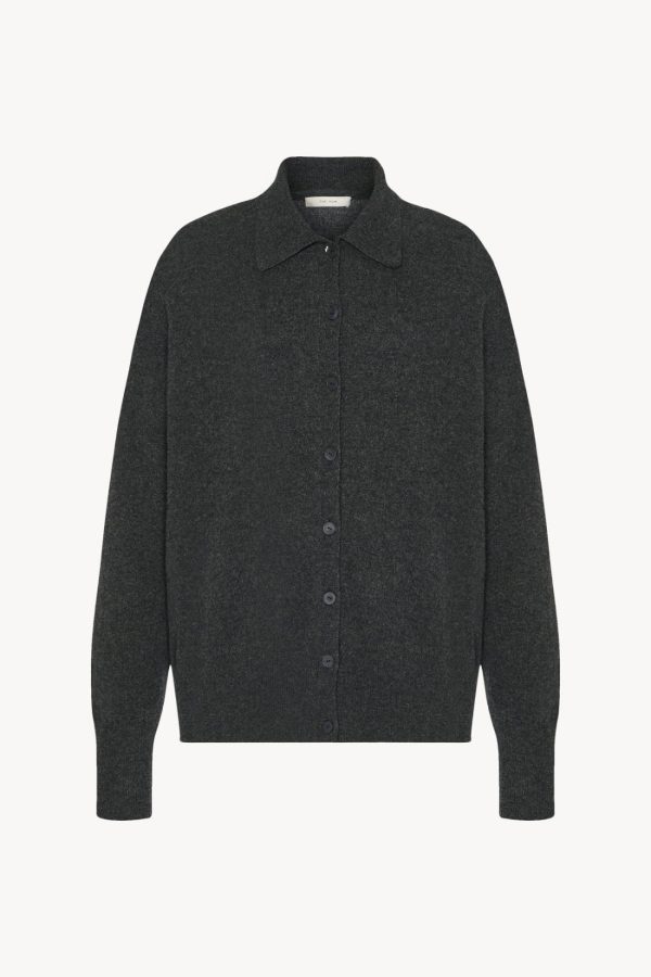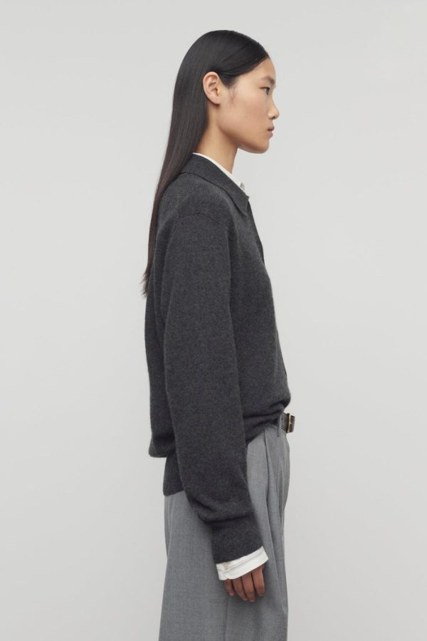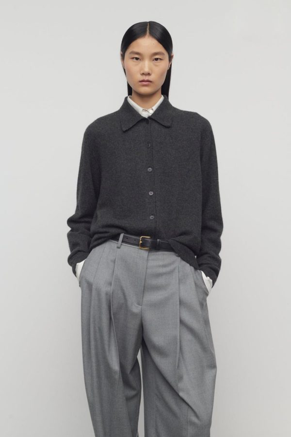 Slightly oversized collared cardigan in soft cashmere with seamless construction, front button closure, and ribbed collar, cuffs, and hem.