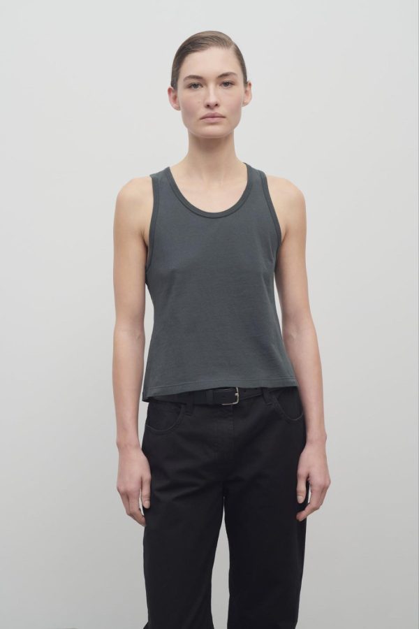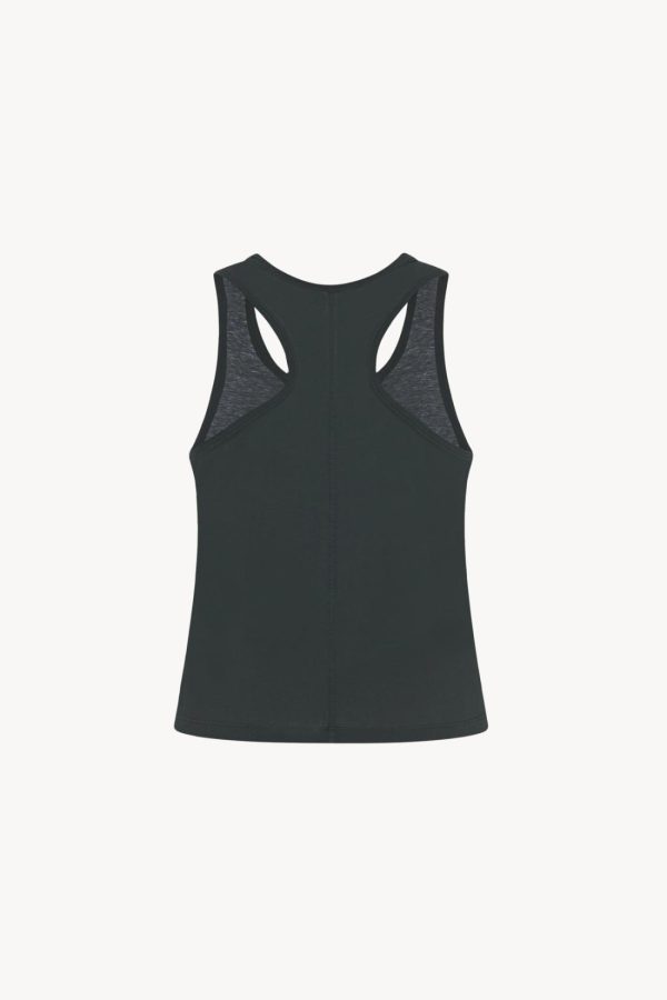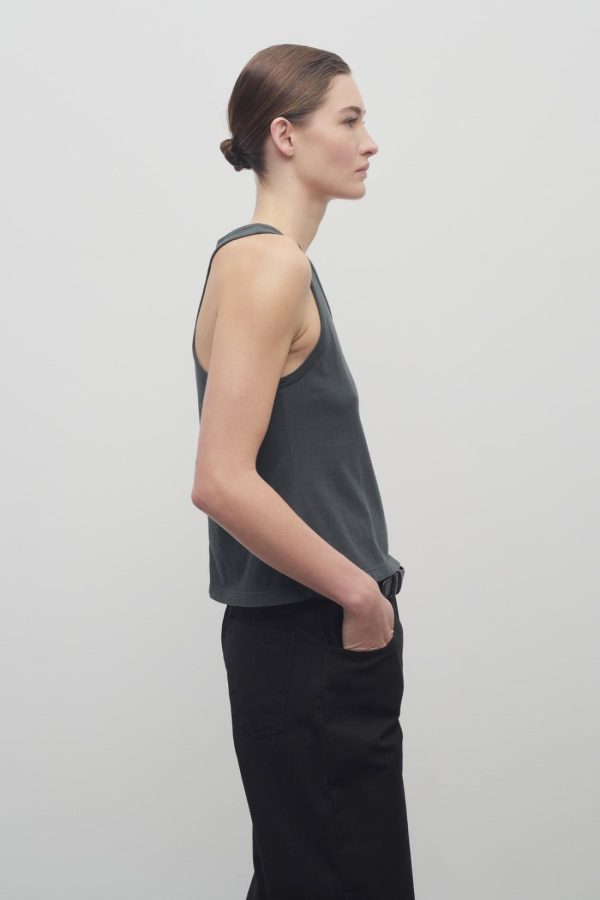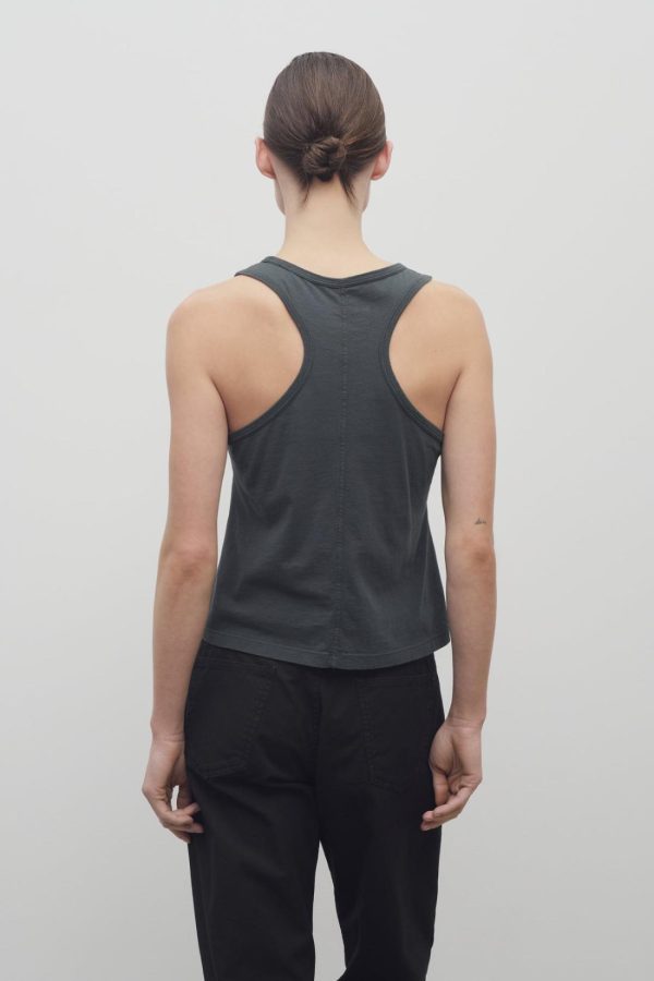Light tank top in organic cotton jersey with slim fit, ribbed neckline, and signature center back detail.