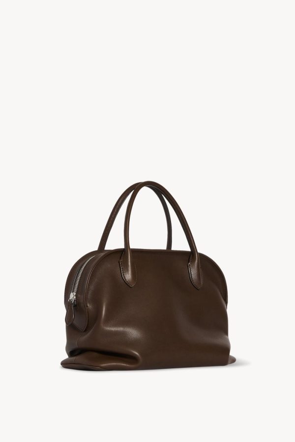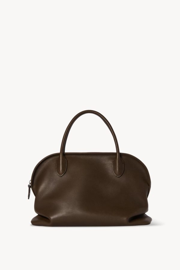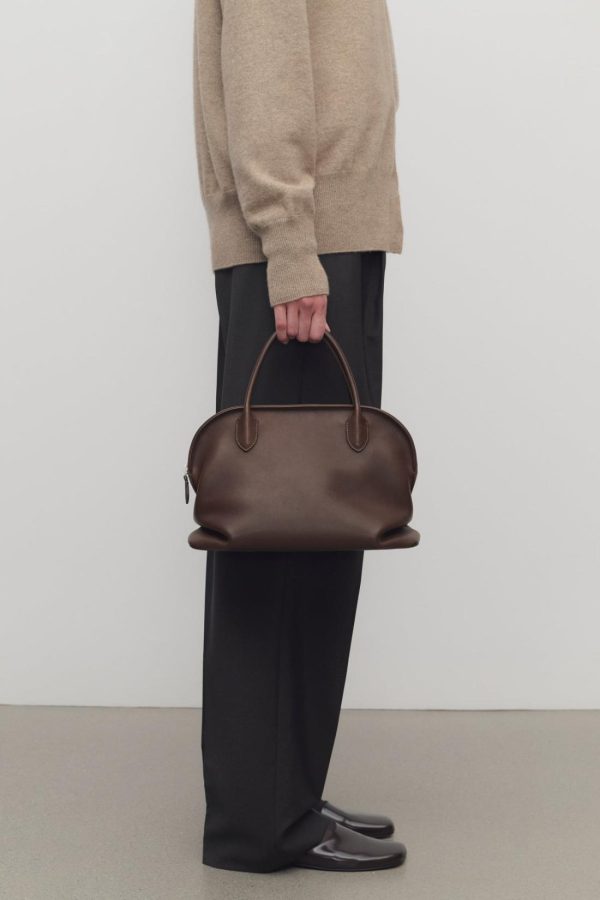 Top handle bag in polished saddle leather with softly slouched base, tubular handles, and zipper closure.