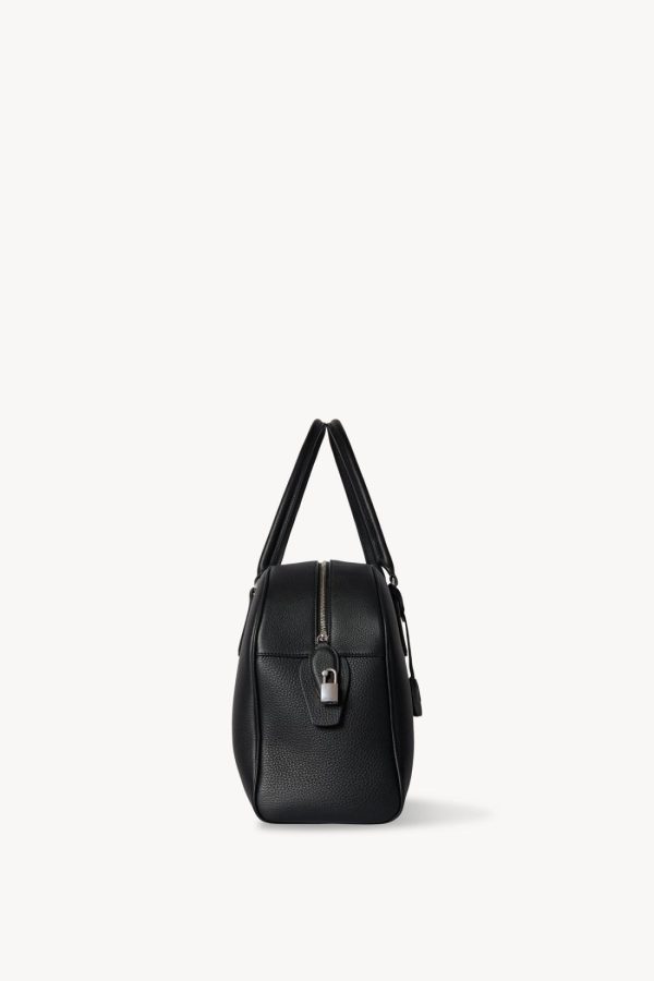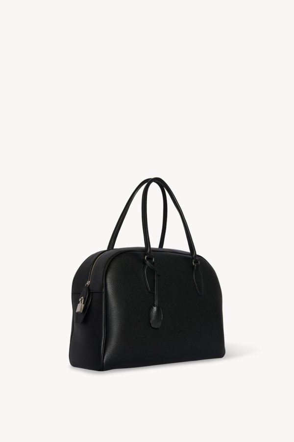 Updated bowling bag in textured calfskin leather with tubular handles, branded metal padlock and key, and zipper closure.