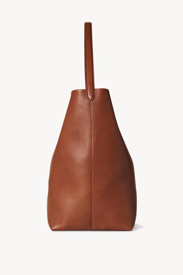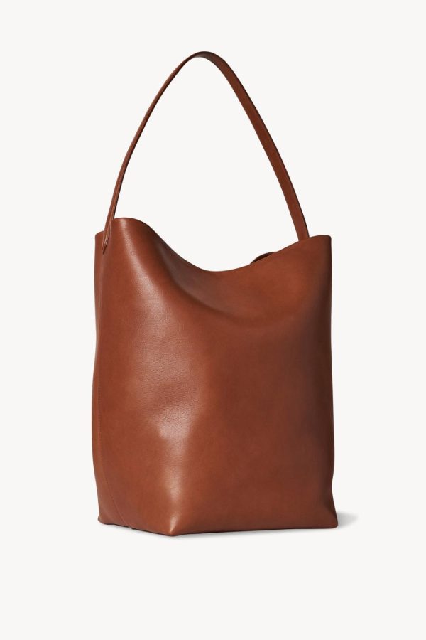 Classic tote bag in polished saddle leather with interior tie closure and flat handle.