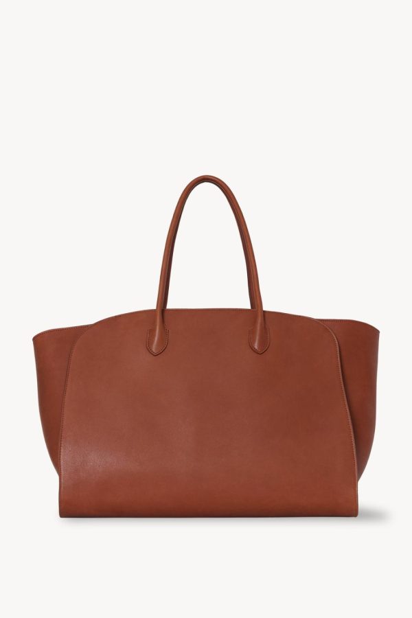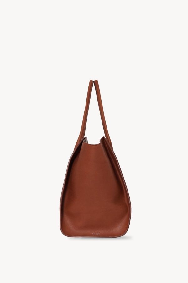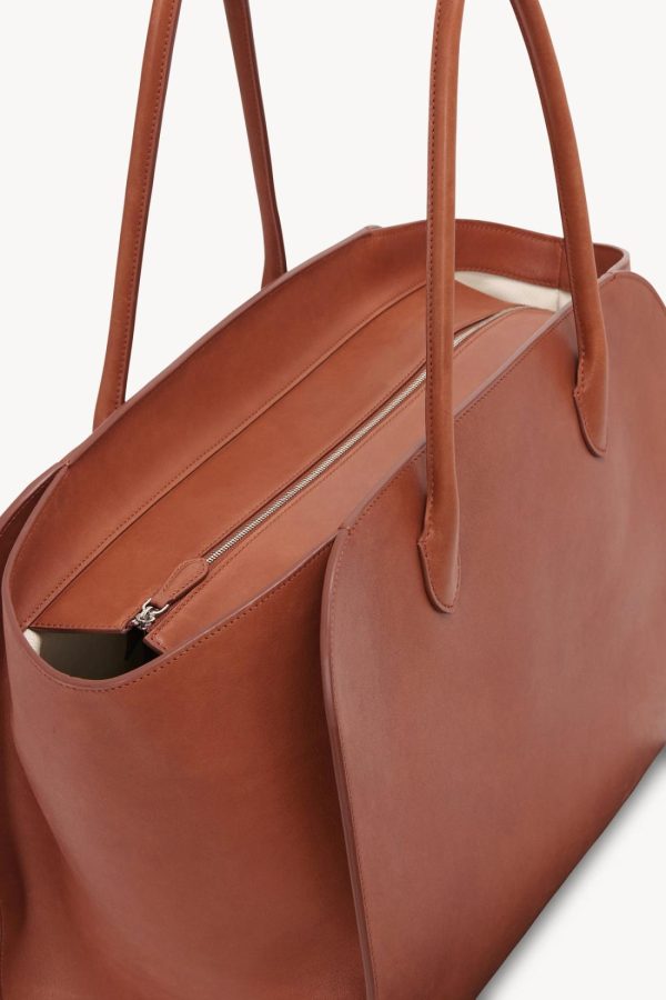 Softly structured tote bag in polished saddle leather with tubular handles, gusseted side panels, and top zipper closure.