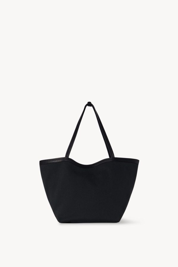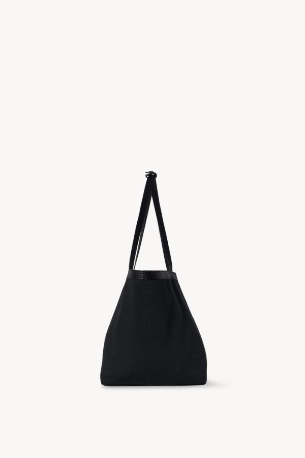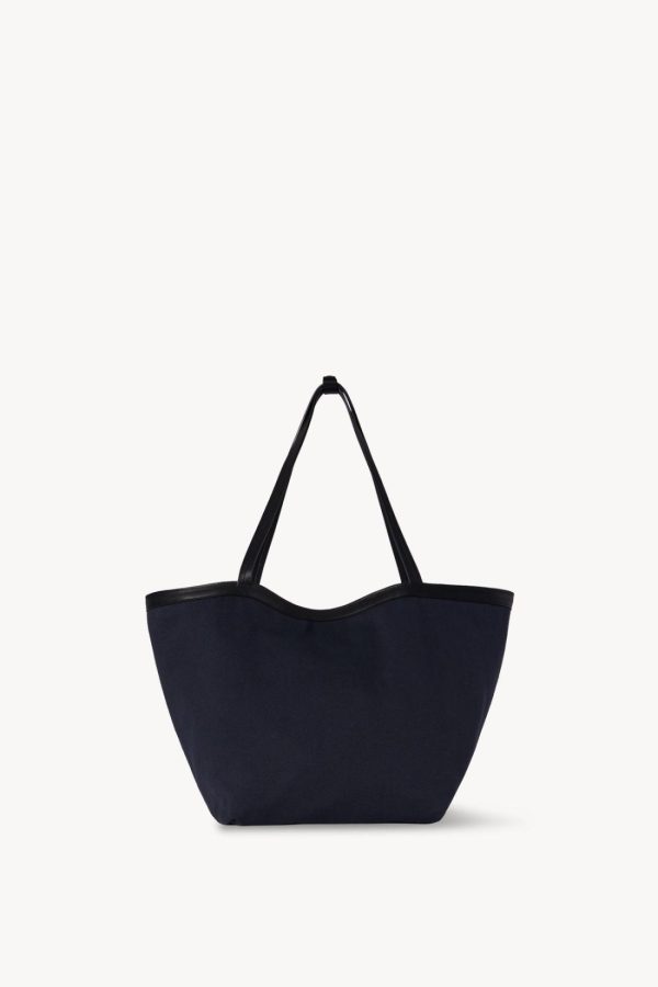 Classic tote bag in textured cotton twill with interior toggle closure, saddle leather trim, and interior wristlet with adjustable strap.