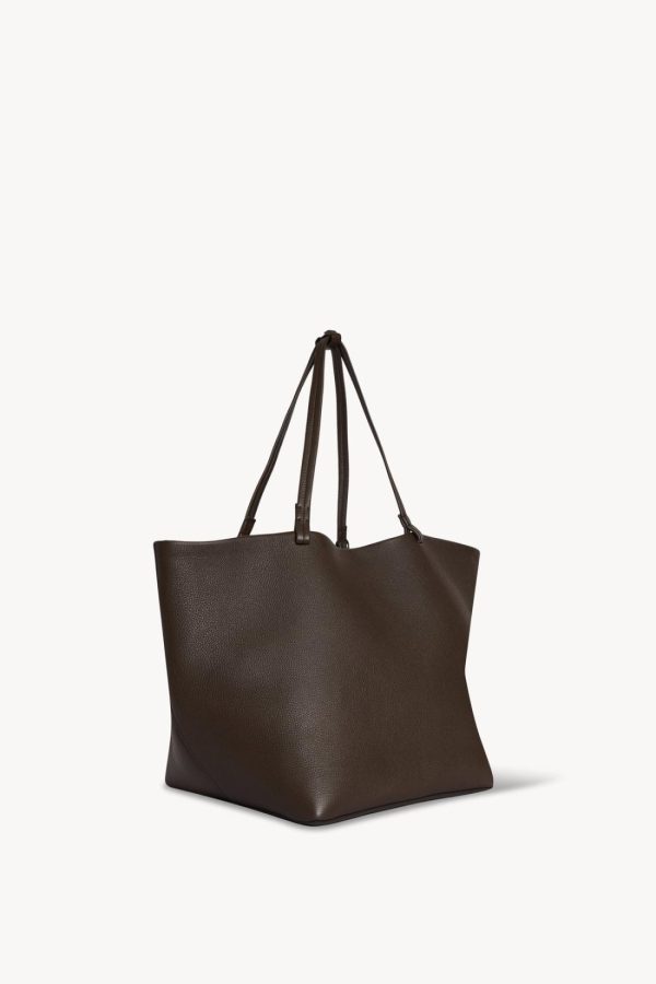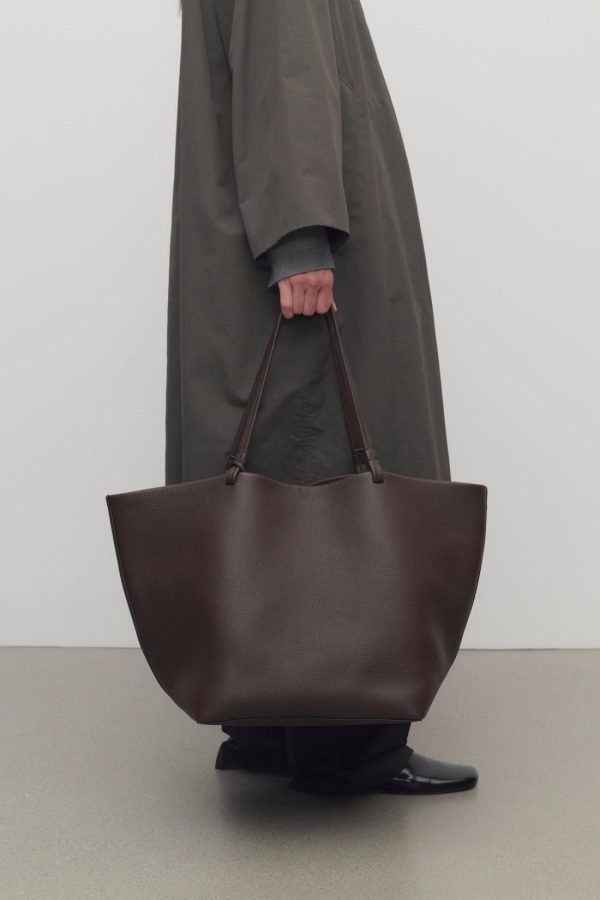 Classic tote bag in textured calfskin leather with interior tie closure, flat handles, and removable interior wristlet with adjustable strap.