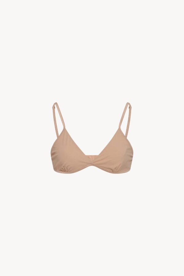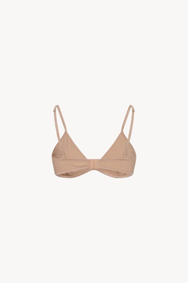 Triangle bralette in ultra-light breathable jersey with adjustable spaghetti straps, ruched front detail, and back hook and eye closures.